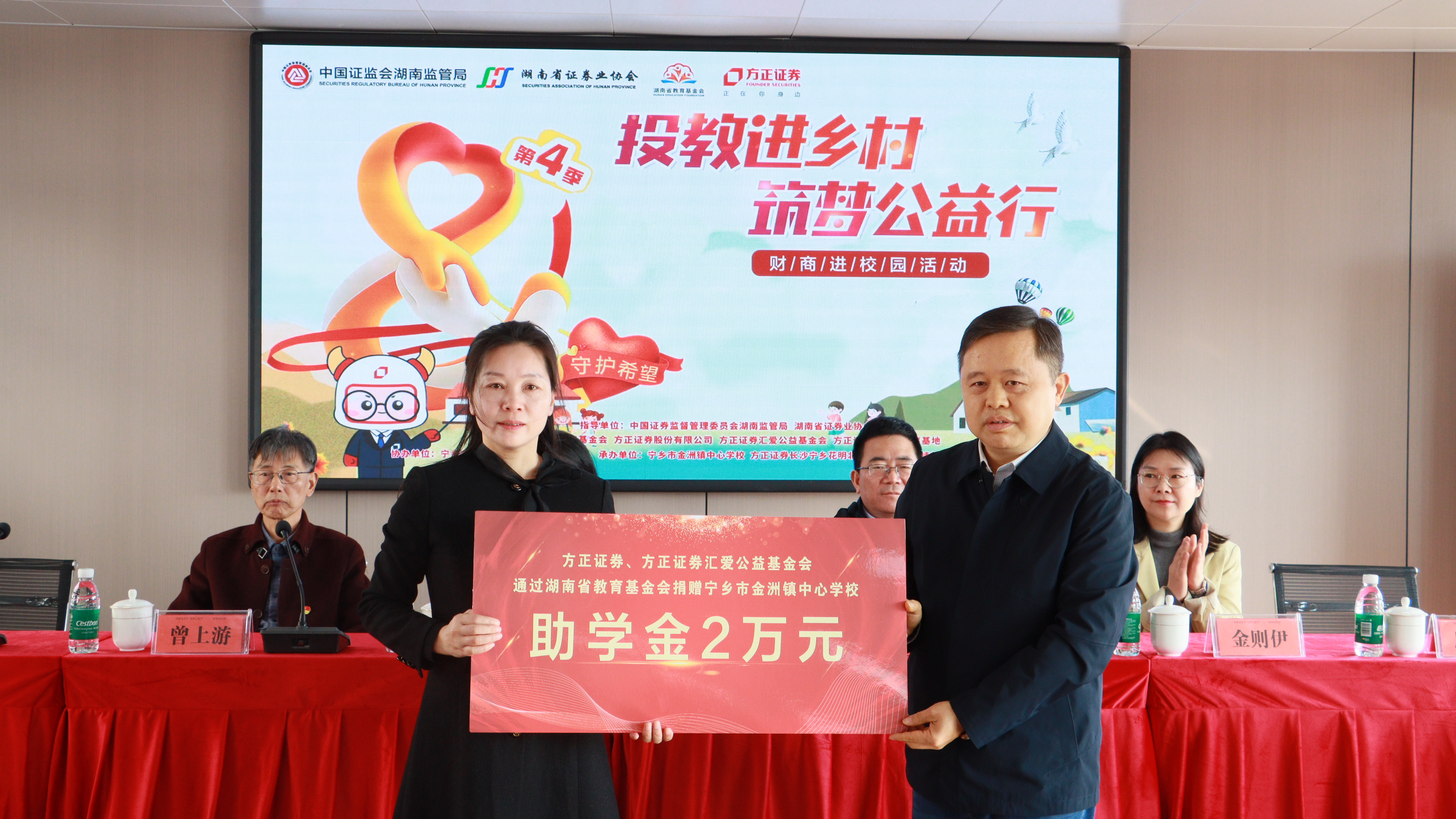 本次活动是在湖南证监局指导下,由湖南省教育基金会、方正证券股份有限公司、方正证券汇爱公益基金会共同主办。通过开展投教示范村建设、困难学生资助、“财商进校园”等多项举措,将金融知识带到乡镇,赋能投资者教育“最后一公里”,助力乡村振兴。