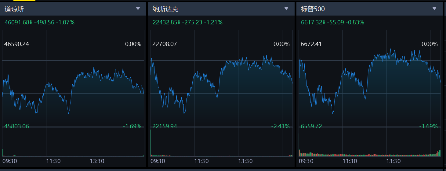 财联社11月19日电,美股三大指数集体收跌,道琼斯指数跌1.07%,标普500指数跌0.83%,纳斯达克综合指数跌1.21%。大型科技股多数下挫,亚马逊、AMD跌超4%,微软、英伟达跌超2%,特斯拉跌超1%。