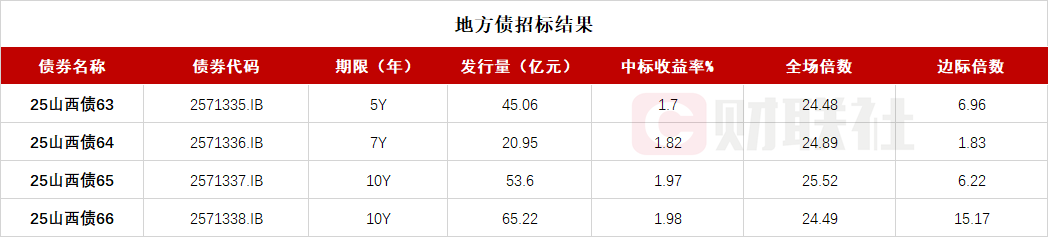 财联社11月20电,山西省政府四期地方债已招标结束,投标倍数均在24倍之上,具体中标信息如下: