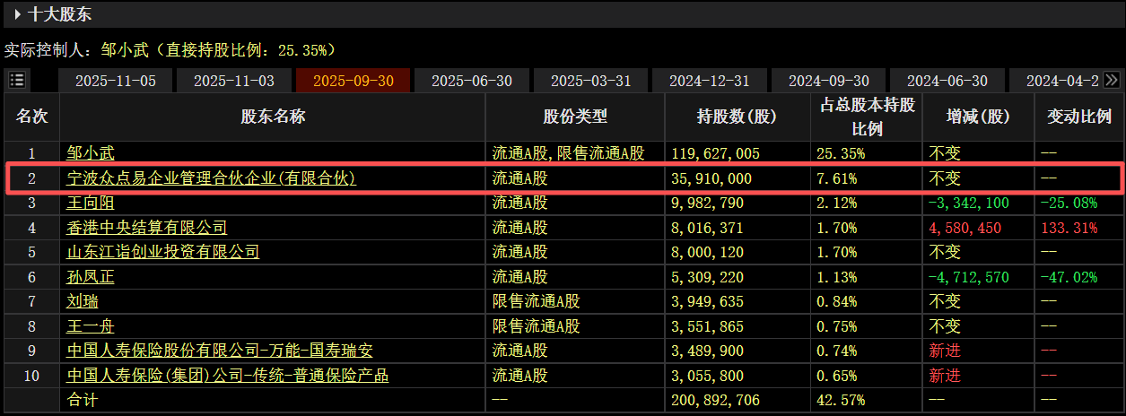 小财注:截至三季度末,宁波众点易企业管理合伙企业位列易点天下第二大股东,持股3591万股,占公司总股本的7.61%。易点天下9月26日公告,宁波众点易计划在2025年10月28日至2026年1月27日期间减持不超过1415.66万股,占本公司总股本比例3.00%。