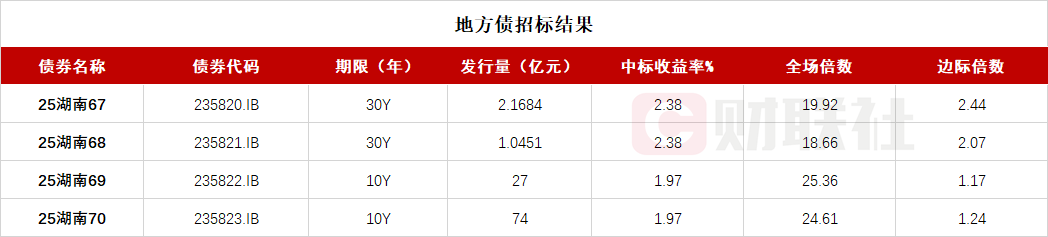 财联社11月25日电,湖南省政府四期地方债已招标结束,投标倍数均在18倍之上,具体中标信息如下: