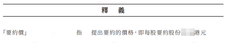 在一次收购业务中,要约价是最为重要的信息之一。因此一般来说,收购要约公告中会有多处提及要约价。我们继续以HKXX公司公告为例说明,在“释义”部分可以找到要约价的信息。如图所示: