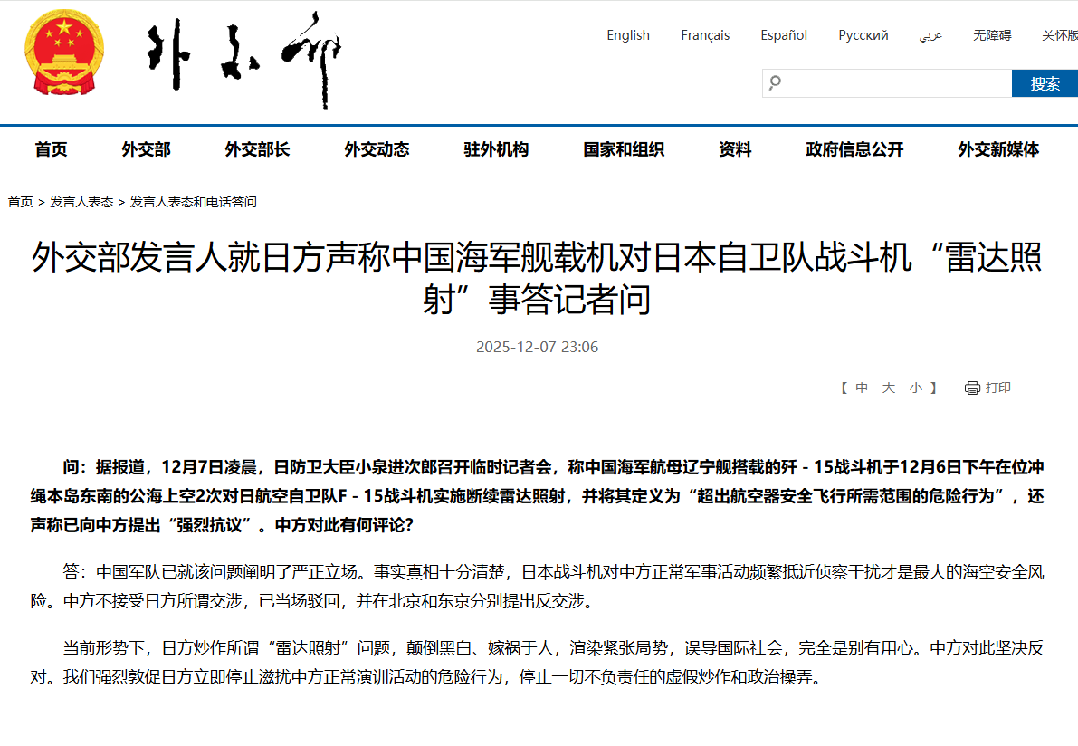 财联社12月7日电,据外交部官网,外交部发言人就日方声称中国海军舰载机对日本自卫队战斗机“雷达照射”事答记者问。