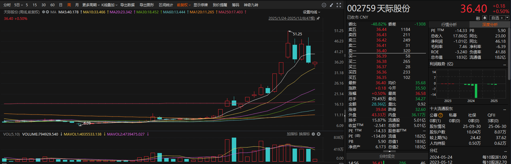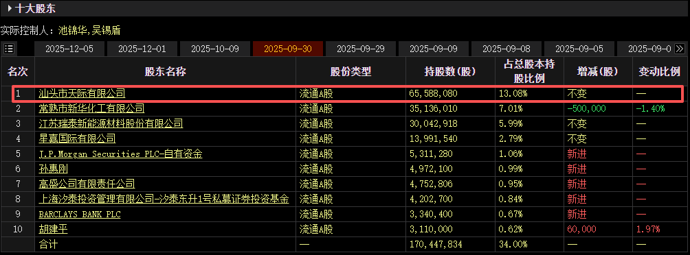 小财注:截至三季度末,汕头天际位列天际股份第一大股东,持有6558.81万股,占总股本比例13.08%。天际股份上周五公告,汕头天际于2025年12月1日至12月5日期间通过集中竞价方式减持1425.63万股,减持比例2.84%。汕头天际及一致行动人星嘉国际持股占公司总股本比例降至12.12%,权益变动触及1%的整数倍。二级市场方面,天际股份自4月低点迄今累计最大涨幅742%。