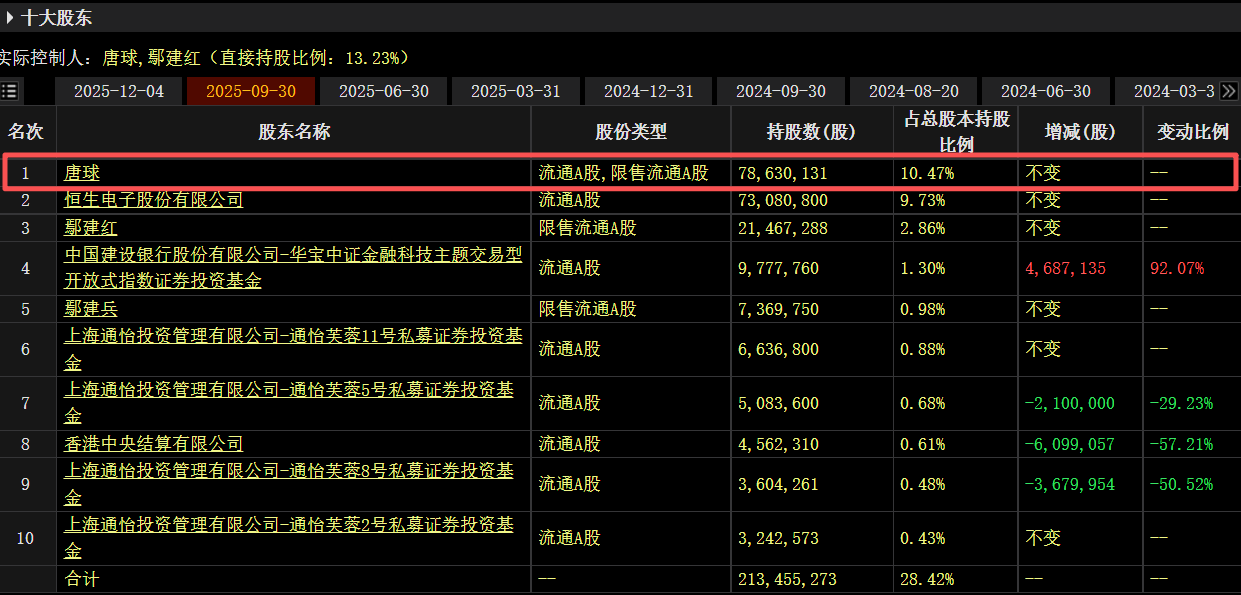 小财注:截至三季度末,唐球位列赢时胜第一大股东,持股7863万股,占公司总股本的10.47%。赢时胜11月7日公告,唐球计划自2025年12月1日至2026年2月28日,以集中竞价或大宗交易方式减持公司股份不超过1400万股,占公司总股本的1.86%。