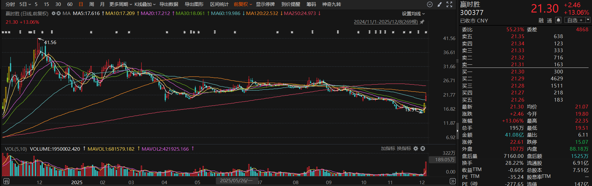 二级市场上,赢时胜自2024年12月高点迄今股价累计最大跌幅达63%。赢时胜上周五收盘20CM涨停,今日收盘涨超13%。