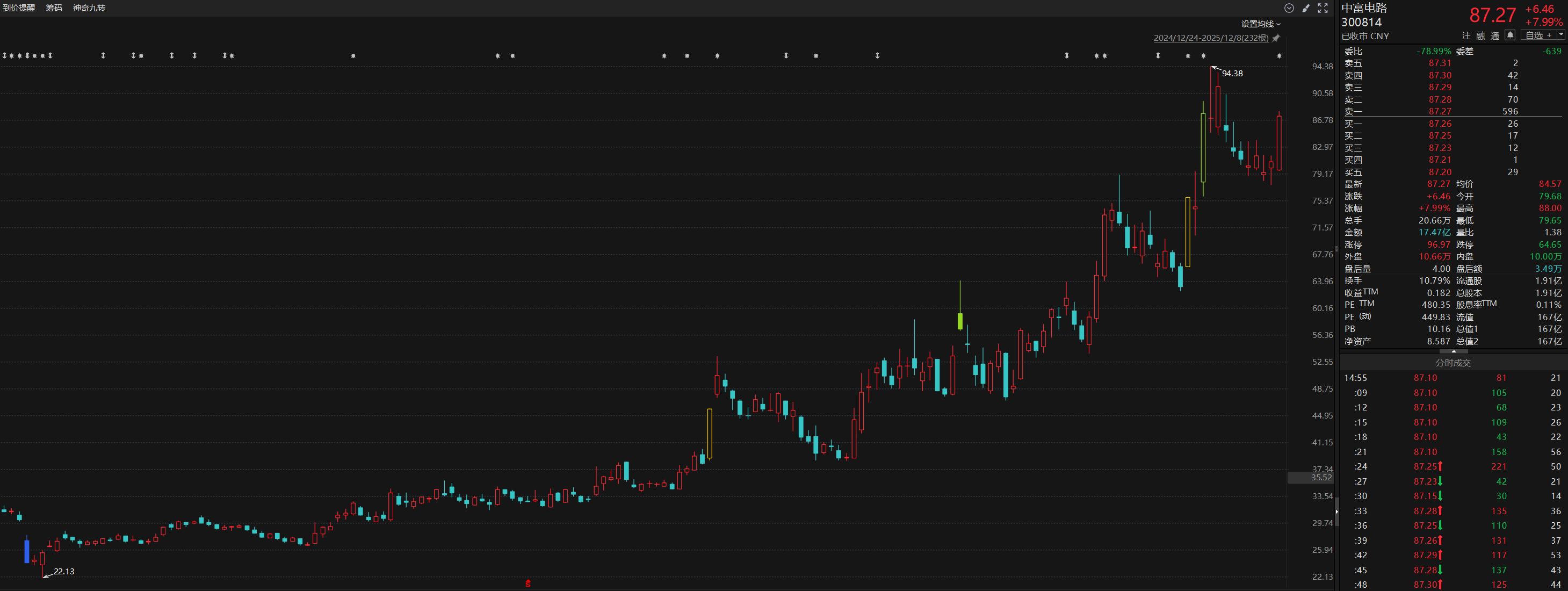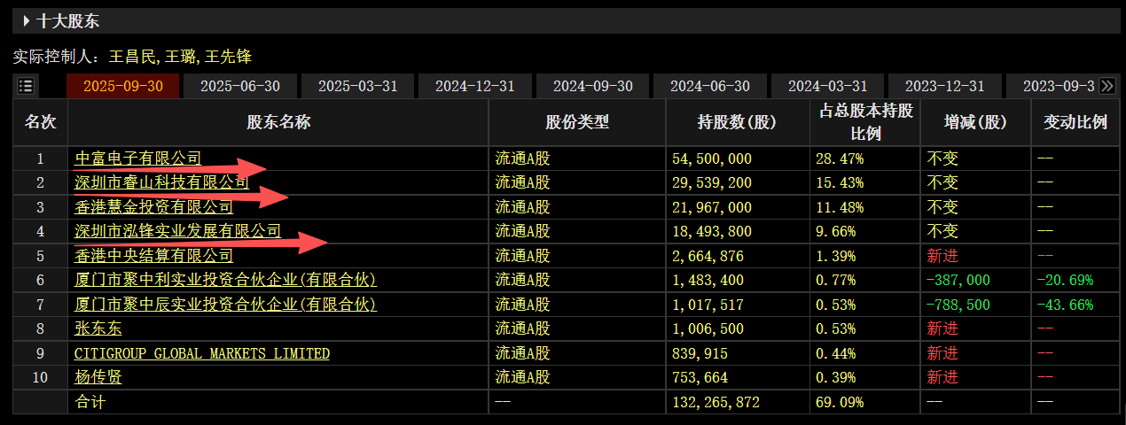 小财注:截至三季度末,中富电子、睿山科技、泓锋实业分别位列中富电路第一、第二和第四大股东,持股比例分别为28.47%、15.43%和9.66%。二级市场方面,中富电路股价自4月低点迄今累计最大涨幅326%。