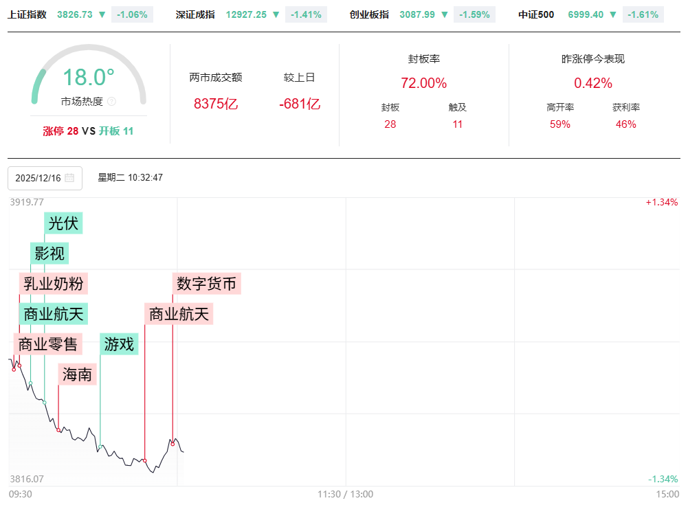 市场早盘震荡调整,三大指数均跌超1%。成交量方面,第一个小时两市缩量667亿元,预计全天成交1.76万亿。当前全市场近4200只个股下跌。板块方面,题材分化轮动,早盘市场热点集中在大消费、智能驾驶方向,其中零售概念反复活跃,百大集团4连板,红旗连锁、广百股份双双2连板;乳业概念再度走强,皇氏集团2连板。智能驾驶概念开盘活跃,浙江世宝、索菱股份等多股涨停。下跌方面,影视院线概念集体调整,博纳影业跌停。