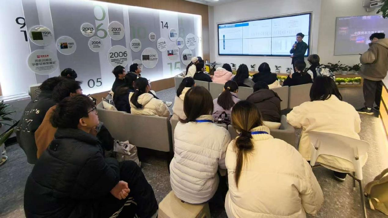 现场参访环节,同学们走进华泰证券“数字华泰运营指挥中心”现场,讲解员向同学们介绍了华泰证券业务和金融科技发展历程、研发与运行保障能力、金融科技生态建设及人才引进培养等内容。
