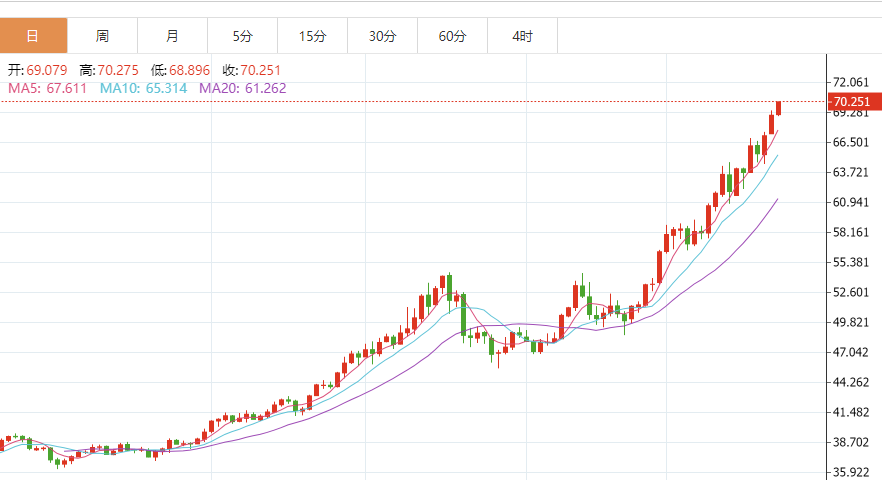 财联社12月23日电,现货白银向上触及70美元/盎司,为历史首次,日内上涨1.45%。现货白银今年累计以来已上涨142%。