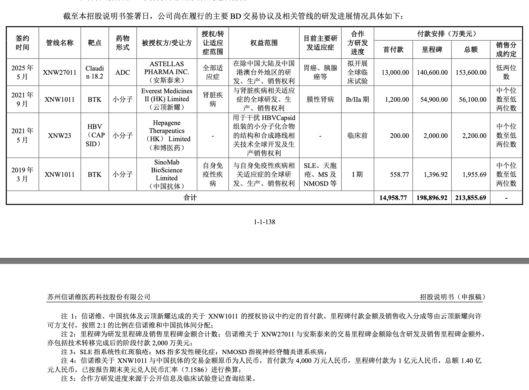 截至本招股说明书签署日,信诺维分别与安斯泰来、云顶新耀、中国抗体等多家公司签署了合作协议,就一系列创新药或技术的研发、生产、注册及销售活动及权益安排作出约定,相关合作条款涉及首付款、里程碑付款、销售收入分成等多种约定。