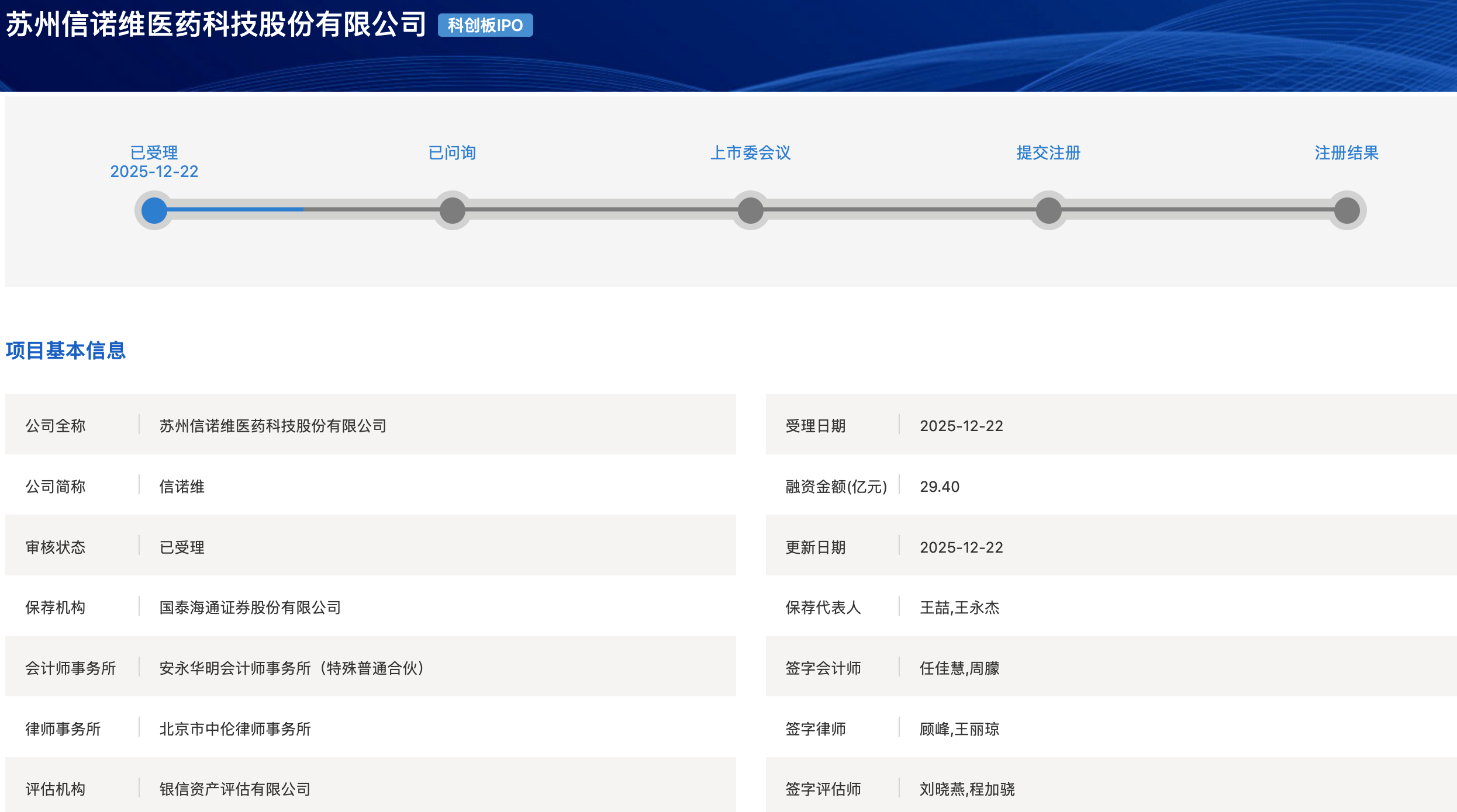 《科创板日报》12月24日讯(记者 黄修眉)苏州信诺维医药科技股份有限公司(下称:“信诺维”)科创板IPO近日获上交所受理,保荐机构为国泰海通证券。