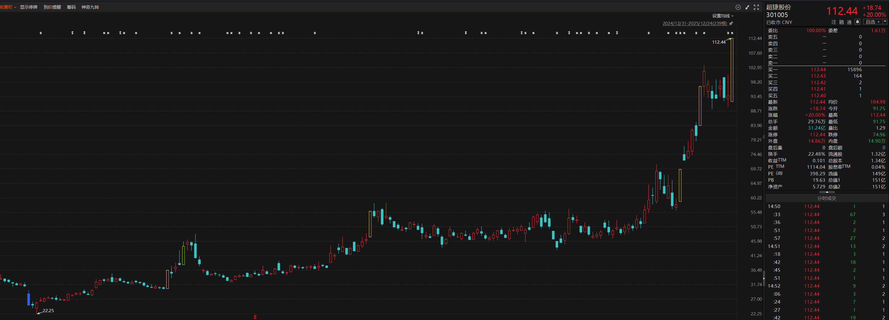 小财注:截至三季度末,上海毅宁位列超捷股份第一大股东,持有6425.42万股,持股比例47.86%。超捷股份10月30日公告,公司控股股东上海毅宁计划3个月内以集中竞价方式或大宗交易方式合计减持不超过2.97%公司股份。二级市场方面,超捷股份收盘20CM涨停,拉长时间来看,其股价自4月低点迄今累计最大涨幅405%。