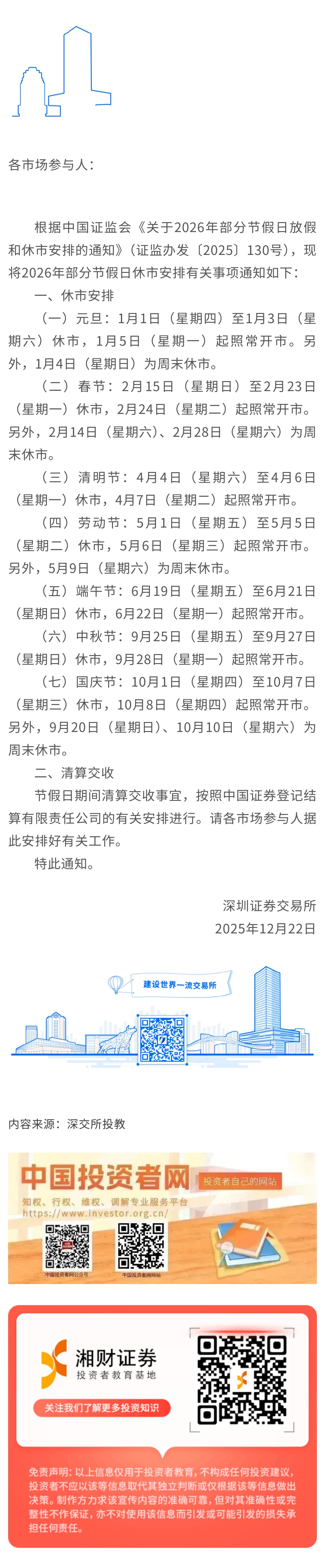 【深交所投教】关于2026年部分节假日休市安排的通知