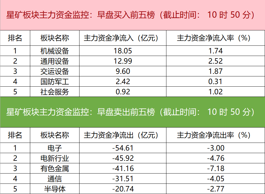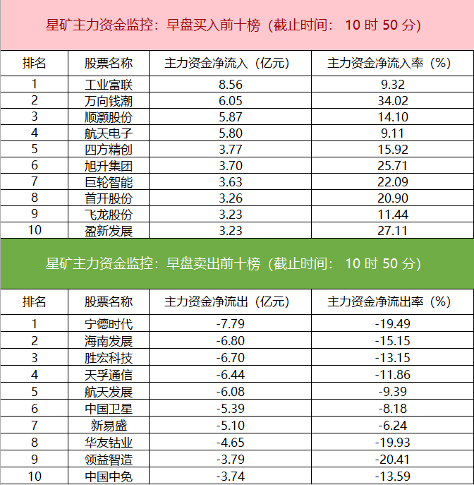 财联社12月25日电,财联社星矿数据显示,今日早盘主力资金净流入机械设备、通用设备、交运设备等板块,净流出电子、电新行业、有色金属等板块,其中电子板块净流出超54亿元。个股方面,工业富联上涨,主力资金净买入超8.56亿元位居首位,万向钱潮、顺灏股份、航天电子获主力资金净流入居前;宁德时代遭净卖出超7亿元,海南发展、胜宏科技、天孚通信资金净流出额居前。