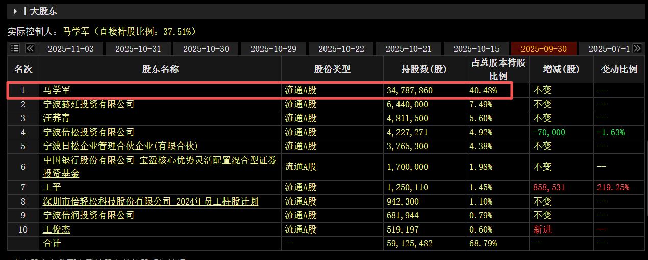 小财注:截至三季度末,马学军位列倍轻松第一大股东,持股比例40.48%。资料显示,马学军,年龄55岁 ,1996年9月至2001年9月就职于深圳市倍轻松保健用品实业有限公司,任董事长兼总经理;2001年9月至2004年6月就职于深圳市倍轻松保健用品实业有限公司,任董事长;2013年至今,任倍轻松董事长等。