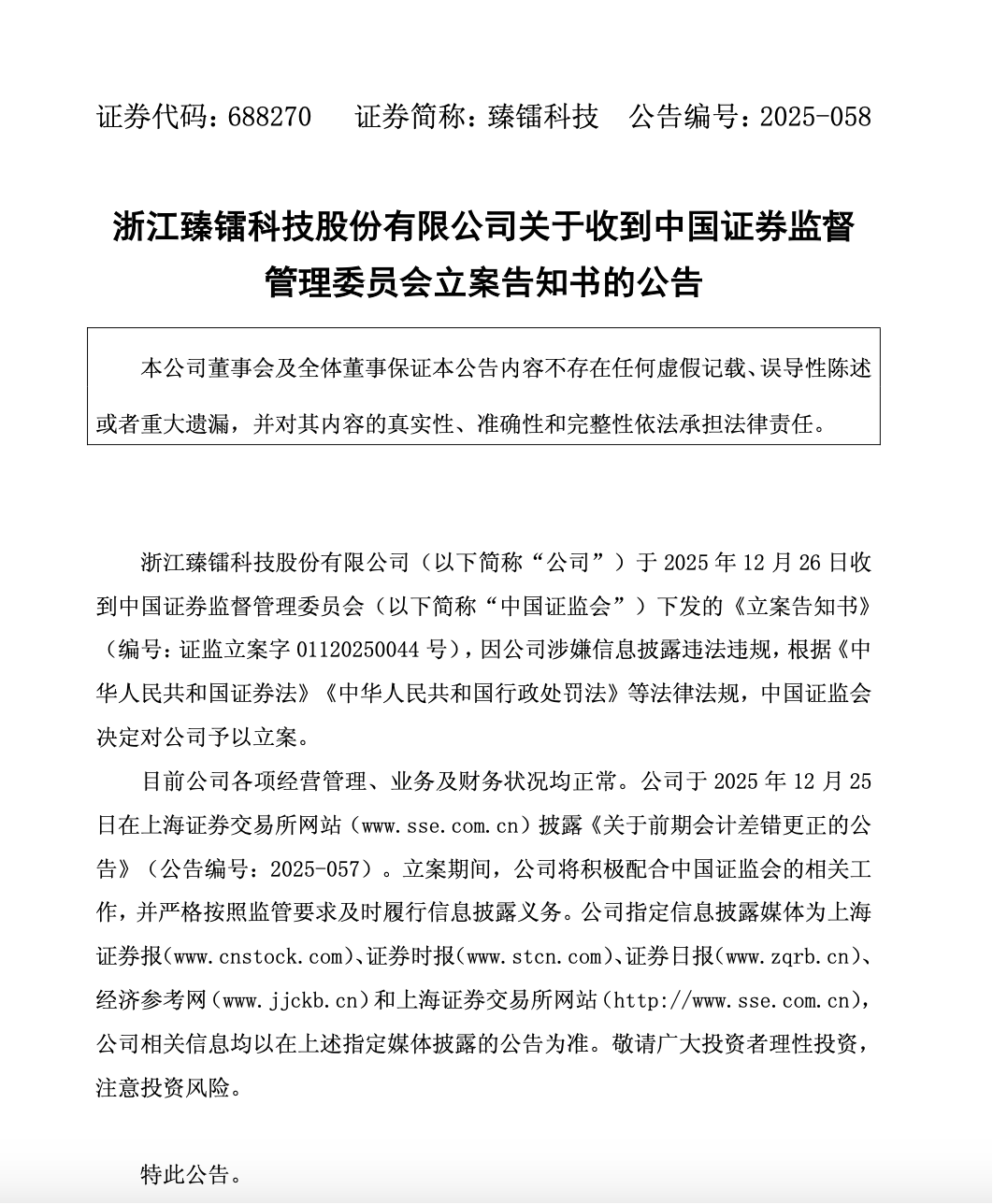 《科创板日报》12月27日讯(记者 王楚凡) 商业航天概念牛股臻镭科技(688270.SH)于12月26日晚间公告称,公司收到中国证监会下发的《立案告知书》。因涉嫌信息披露违法违规,根据相关法律法规,中国证监会决定对公司予以立案。