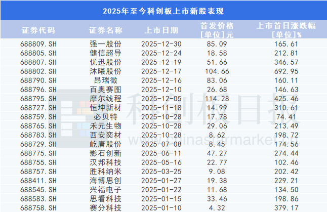 今年以来,包括强一股份在内,科创板共有19只新股上市,科创板公司数量达到600家。2025年科创板新股延续“零破发”态势,平均首日涨幅244.37%。沐曦股份以692.95%的首日涨幅位居榜首,成为2025年科创板新股中表现最为亮眼的个股。摩尔线程紧随其后,首日涨幅达425.46%。