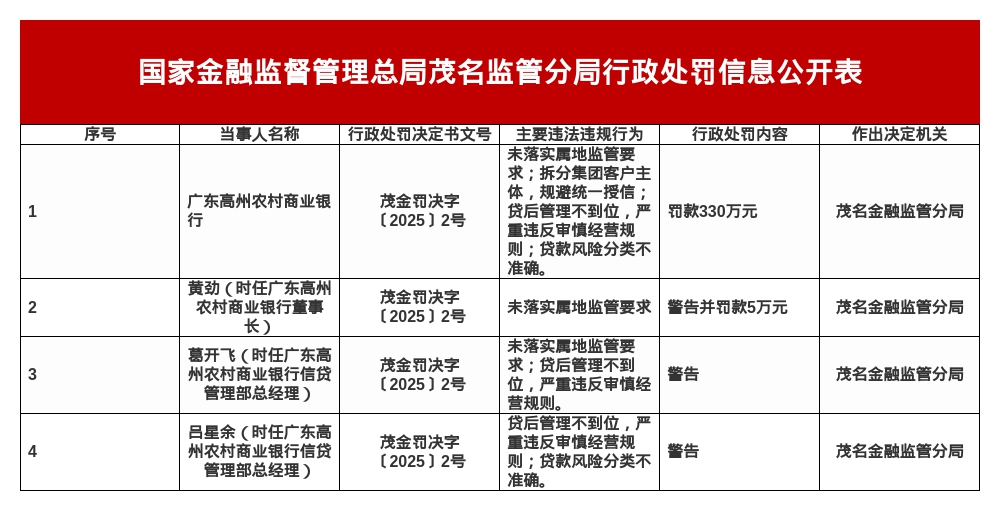 针对上述违法违规行为,茂名金融监管分局对高州农商银行罚款330万元;对黄劲警告并处罚款5万元;对葛开飞警告;对吕星余警告。