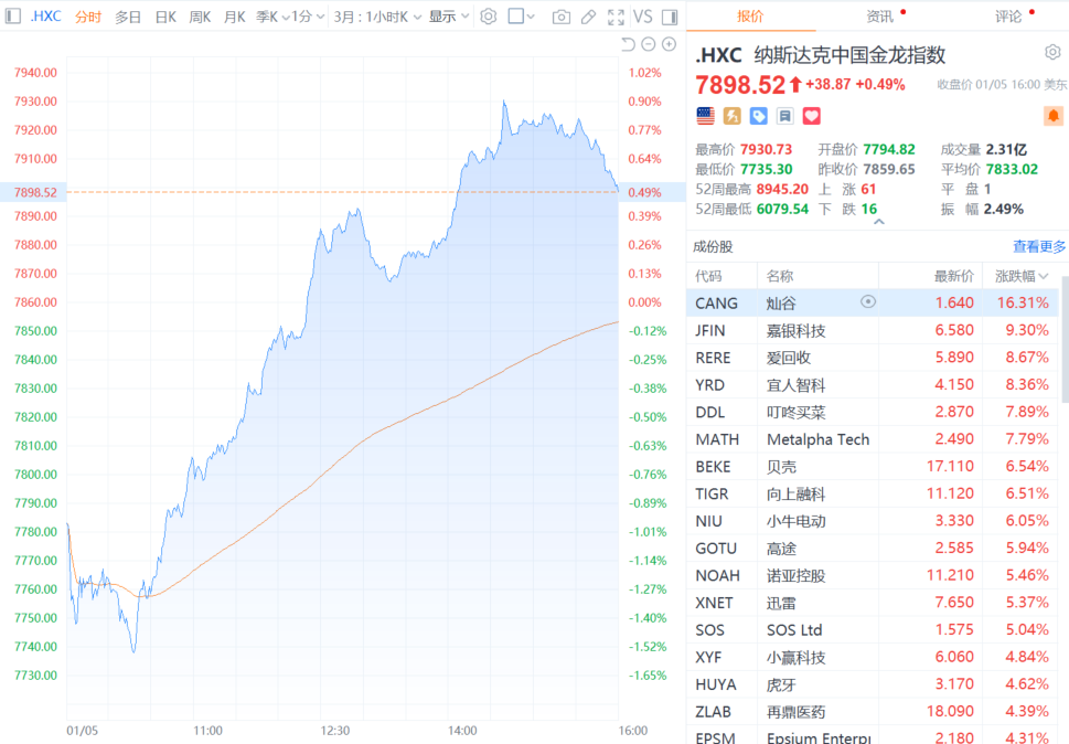 热门中概股多数上涨 纳斯达克中国金龙指数涨0.49%