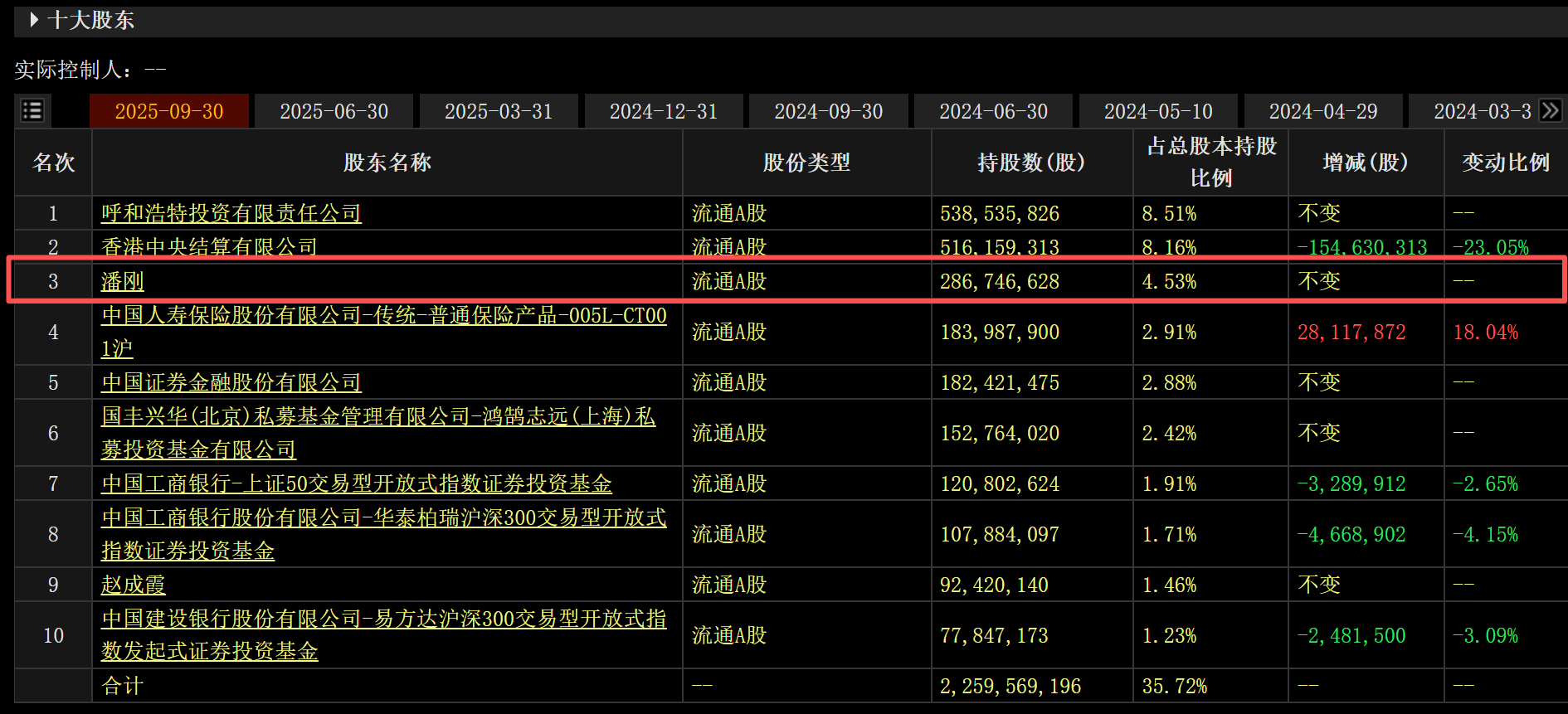 小财注:截至三季度末,潘刚位列伊利股份第三大股东,持股2.87亿股,占公司总股本的4.53%。