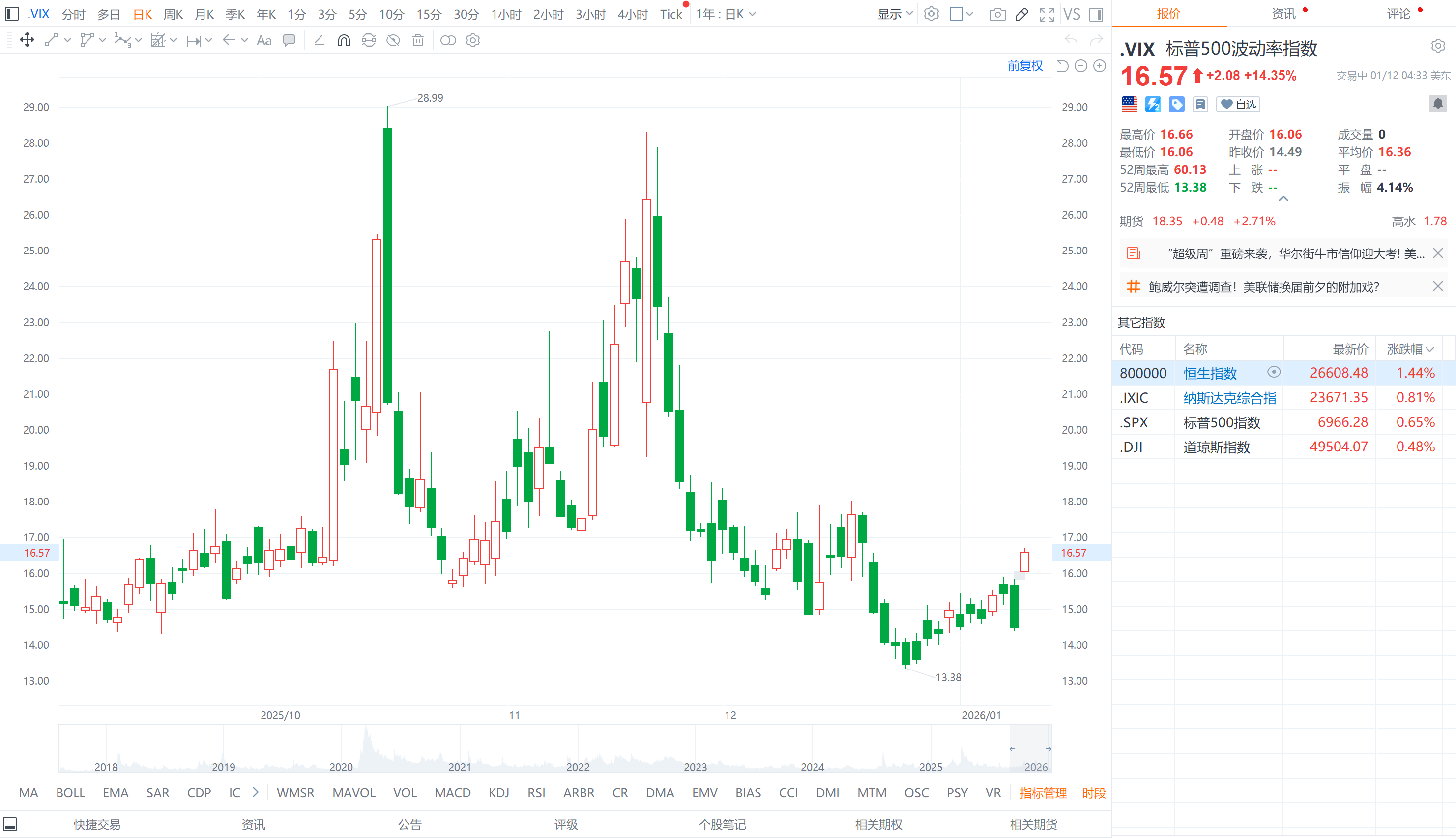财联社1月12日电,美股恐慌指数VIX触及三周高位,最新报16.55点,上涨2.06点。