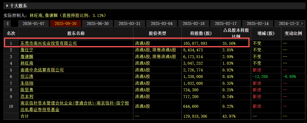 小财注:截至2025年三季度末,南兴投资位列南兴股份第一大股东,持股比例35.56%。南兴股份2025年9月23日公告称,公司控股股东南兴投资计划3个月内减持不超过886.3万股,即不超过3%公司股份。二级市场方面,南兴股份股价自2025年12月低点迄今累计最大涨幅78.15%。