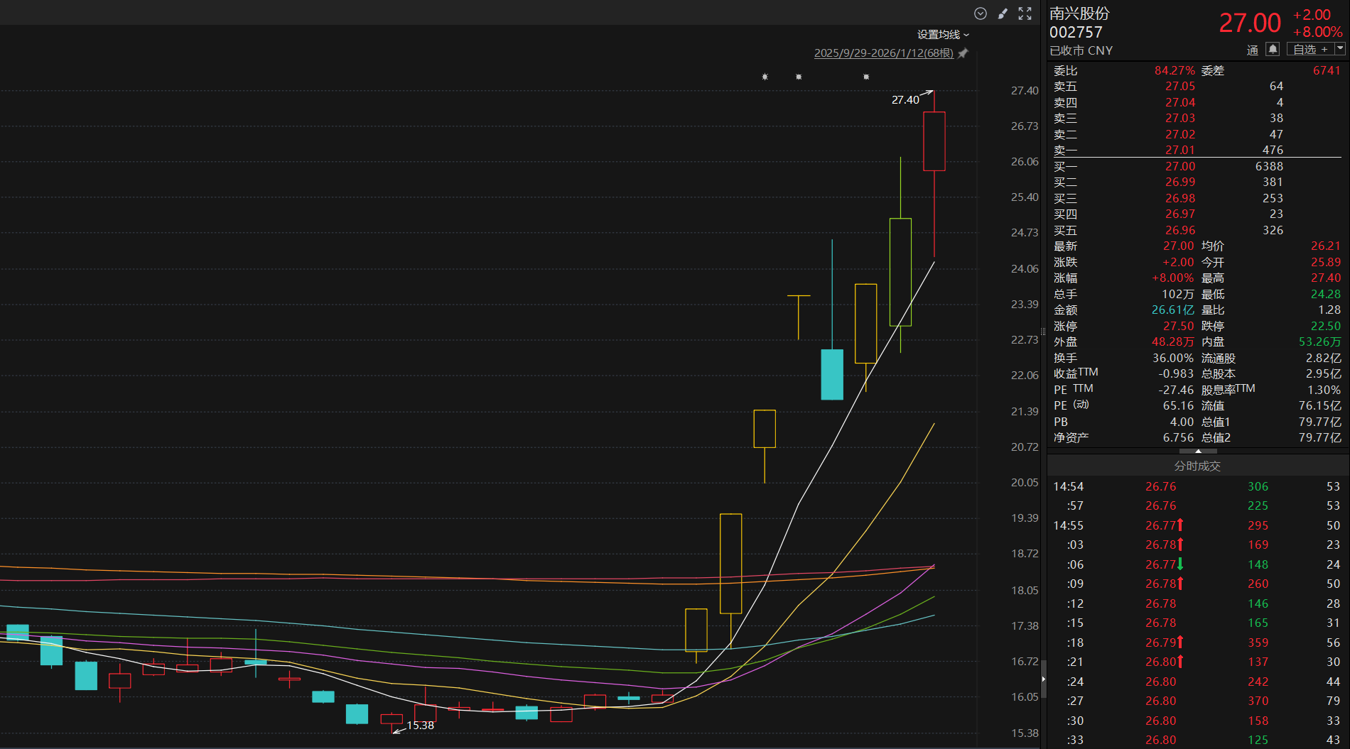 财联社1月12日电,南兴股份(002757.SZ)公告称,公司股票交易价格连续三个交易日收盘价格涨幅偏离值累计超过20%,属于股票交易异常波动情况。公司于2025年9月24日披露了《关于公司控股股东、高级管理人员减持计划的预披露公告》。经确认,截至2026年1月12日,公司控股股东东莞市南兴实业投资有限公司(简称“南兴投资”)合计减持了366.9万股,其中异常波动期间(2026年1月8日、2026年1月9日、2026年1月12日)南兴投资以大宗交易减持了71.5万股,除上述减持外,公司实际控制人林旺南、詹谏醒不存在在异常波动期间减持的情况。截至目前,南兴投资的减持计划尚未实施完毕。