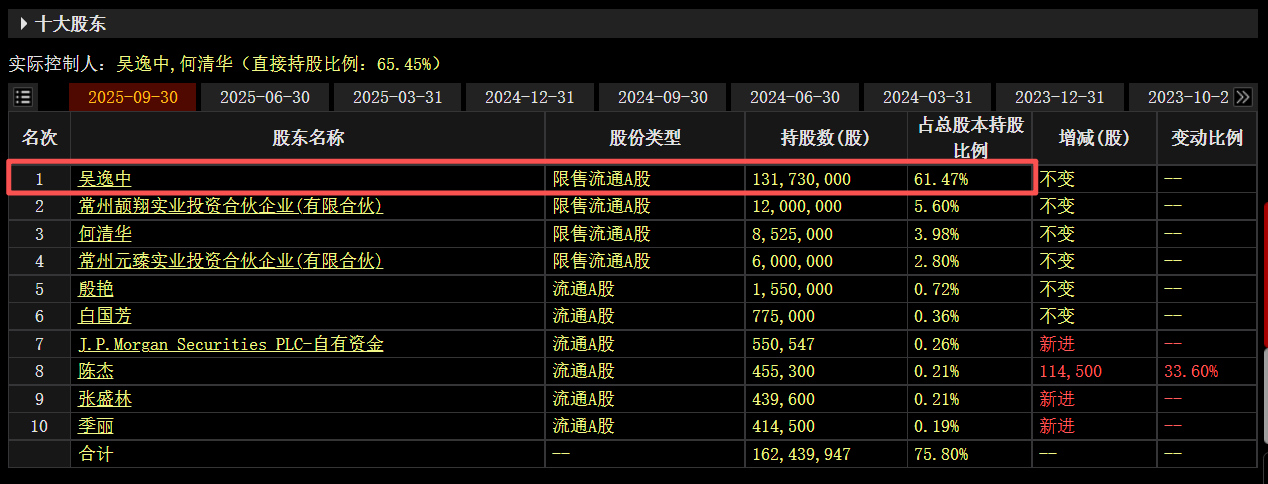 小财注:截至2025年三季度末,吴逸中位列天元智能第一大股东,持股数量1.32亿股,持股比例61.47%。公开资料显示,吴逸中2015年12月至今任江苏天元智能装备有限公司董事长兼总经理,2018年5月至今任常州英特力杰机械制造有限公司执行董事兼总经理,其2024年年薪40.72万元。