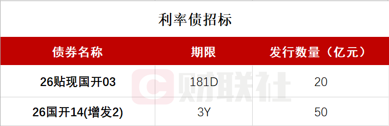 财联社1月19日电,按照此前公布的发行计划,国家开发银行将于下午14:30-15:30招标发行两期金融债,分别为:2026年第三期贴现金融债券,期限181D,发行量不超过20亿元;2026年第十四期金融债券(第二次增发),期限3年,发行量不超过50亿元,票面利率1.68%。
