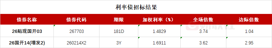 财联社1月19日电,从银行间市场获悉,国开行两期金融债已结束招标,其中:181天期品种中标收益率为1.4829%,全场倍数3.74,边际倍数1.04;3年期品种中标收益率1.6911%,全场倍数3.62,边际倍数2.95。