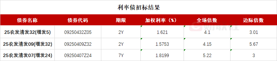 财联社1月20日电,农发行三期金融债已结束招标,其中:2Y期品种25农发清发09(增发32)中标收益率1.5753%,全场倍数4.15,边际倍数5.67;2Y期品种25农发清发32(增发5)中标收益率1.621%,全场倍数4.1,边际倍数3.01;7Y期品种中标收益率1.8199%,全场倍数5.22,边际倍数3。