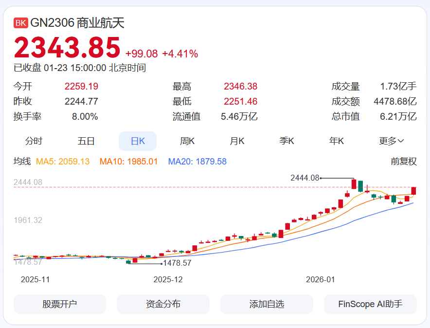 《科创板日报》1月24日讯(记者 吴旭光) 商业航天板块继续反弹,1月23日,相关指数大涨3.21%,个股多点开花,其中商业航天+3D打印联动概念股备受市场关注。