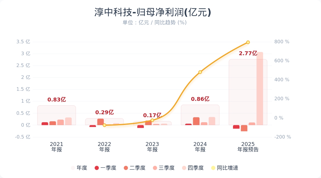 财联社1月26日电,淳中科技(603516.SH)公告称,预计2025年度归属于上市公司股东的净利润为2.65亿元至2.90亿元,与上年同期相比增长208.86%至238.00%。报告期末,公司持有沐曦股份股票数量为85.43万股。因存在限售期,公允价值计量需考虑流动性折价的影响,经专业评估机构初步评估,该笔投资预计增加报告期公允价值变动收益3.56亿元,考虑递延所得税费用后对归属于上市公司股东的净利润影响额为3.03亿元。小财注:Q3净利润0.11亿,据此计算,预计Q4净利润2.94亿-3.19亿,环比变动2629%-2861%。第四季度净利润分析师一致预测是1.61亿,业绩高于预期。
