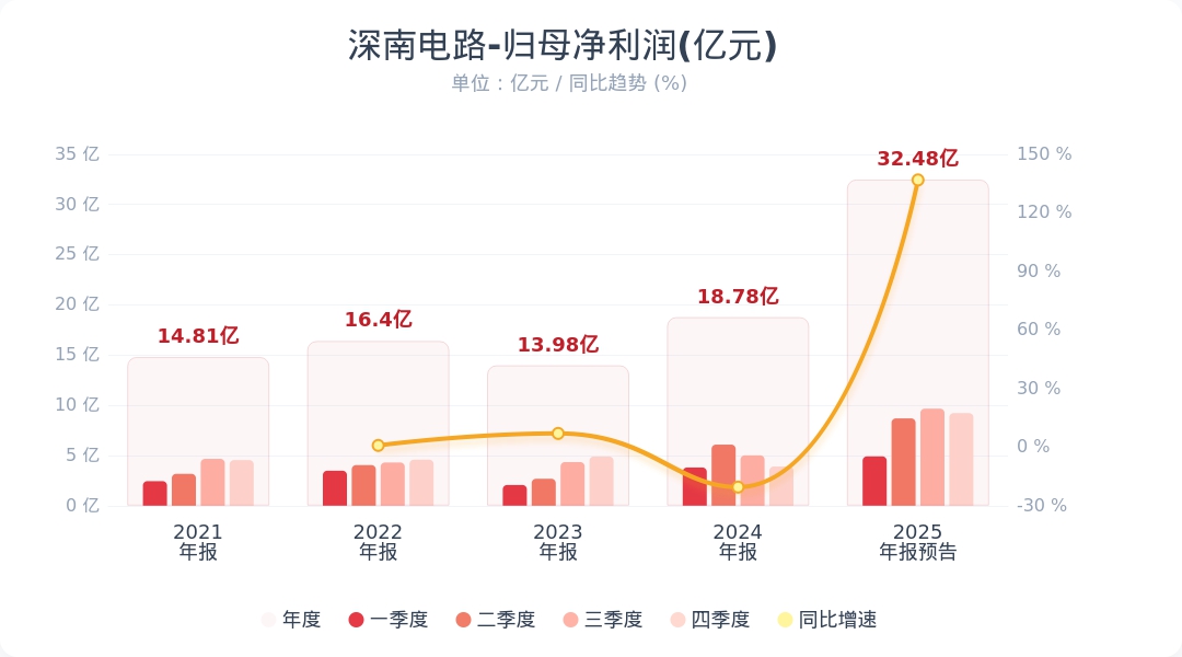 财联社1月27日电,深南电路(002916.SZ)公告称,公司预计2025年归属于上市公司股东的净利润为31.54亿元-33.42亿元,比上年同期增长68.00%-78.00%。报告期内,公司充分把握AI算力升级、存储市场需求增长、汽车电动智能化三大增长机遇,通过强化市场开发力度、提升市场竞争力,推动产品结构优化。同时,深入推进数字化转型与智能制造升级,提升运营管理能力,助益公司营收规模和利润实现同比增长。小财注:深南电路2025年Q3净利9.66亿元,据此计算,2025年Q4净利预计8.28亿元-10.16亿元,环比变动-14%-5%。第四季度净利润分析师一致预测是7.61亿,业绩高于预期。