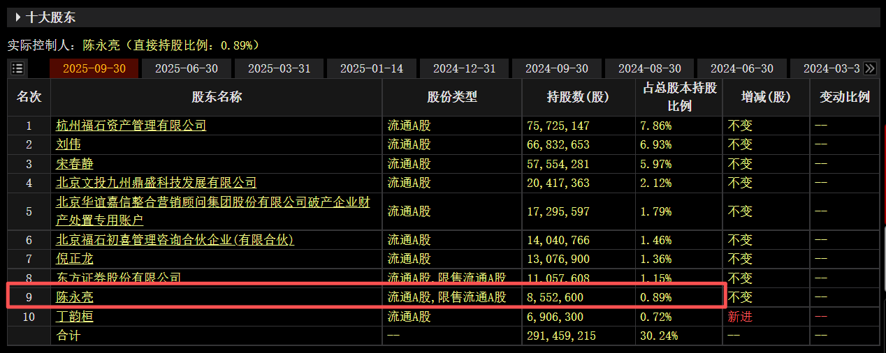 小财注:截至2025年三季度末,陈永亮直接持有福石控股855.26万股,持股比例0.89%。