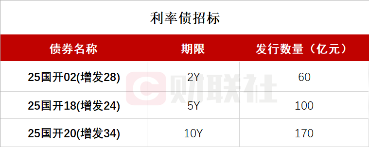 财联社2月3日电,按照此前公布的发行计划,国开行将于上午09:30-10:30招标发行三期金融债,分别为:2025年第二期金融债券(第二十八次增发),期限2年,发行量不超过60亿元,票面利率1.52%;2025年第十八期金融债券(第二十四次增发),期限5年,发行量不超过100亿元,票面利率1.79%;2025年第二十期金融债券(第三十四次增发),期限10年,发行量不超过170亿元,票面利率1.87%。