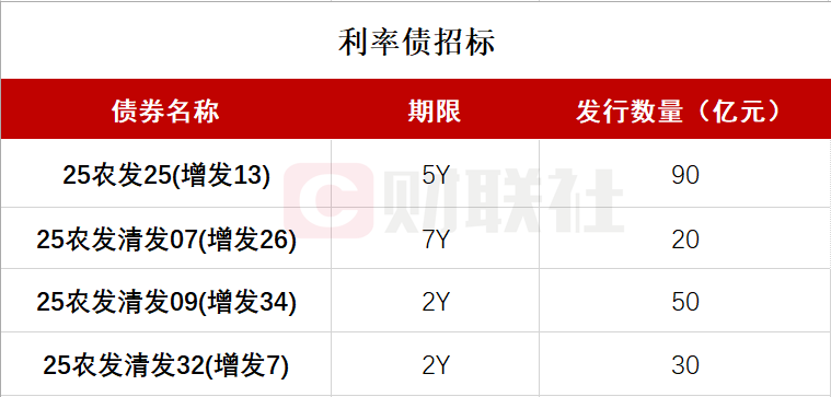 财联社2月3日电,按照此前公布的发行计划,中国农业发展银行将于上午10:00-11:00和下午14:00-15:00招标发行四期固息金融债,分别为:2025年第二十五期金融债券(第十三次增发),期限5年,发行量不超过90亿元,票面利率1.69%;在上海清算所2025年第七期金融债券(第二十六次增发),期限7年,发行量不超过20亿元,票面利率1.84%;在上海清算所2025年第九期金融债券(第三十四次增发),期限2Y,发行量不超过50亿元,票面利率1.38%;在上海清算所2025年第三十二期金融债券(第七次增发),期限2Y,发行量不超过30亿元,票面利率1.67%。