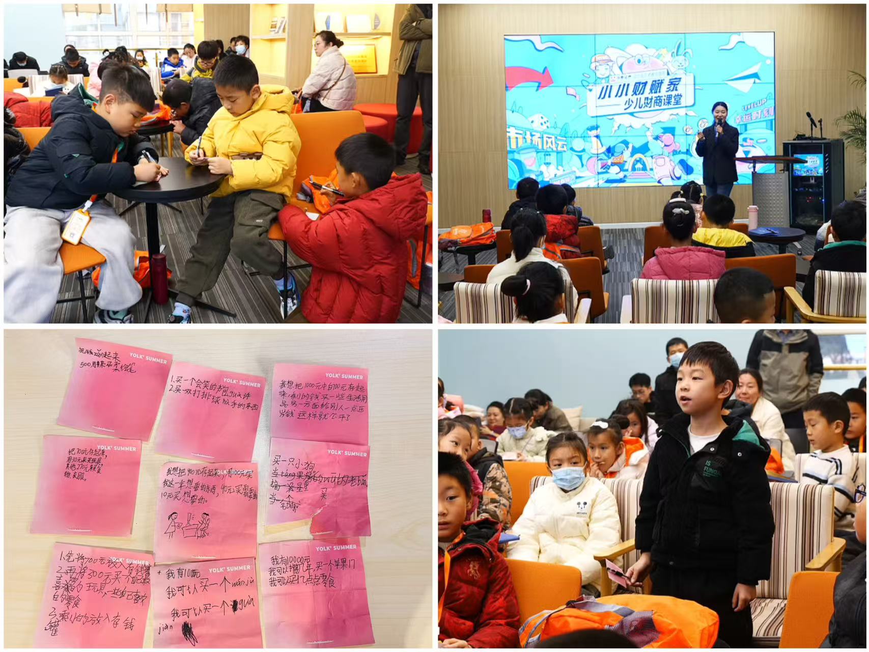 “财富梦想”分享环节中,孩子们踊跃交流课堂收获与零花钱管理计划,畅谈心中“大梦想”,将财商知识与个人成长规划相结合。活动最后,全体参与者合影留念,为这场充实的财商启蒙之旅画上圆满句号。