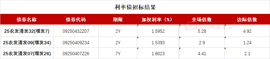 财联社2月3日电,农发行三期金融债已结束招标,其中:2Y期品种25农发清发09(增发34)中标收益率1.5393%,全场倍数2.9,边际倍数1.24;2Y期品种25农发清发32(增发7)中标收益率1.5952%,全场倍数5.28,边际倍数4.92;7Y期品种中标收益率1.8023%,全场倍数4.41,边际倍数2.1。