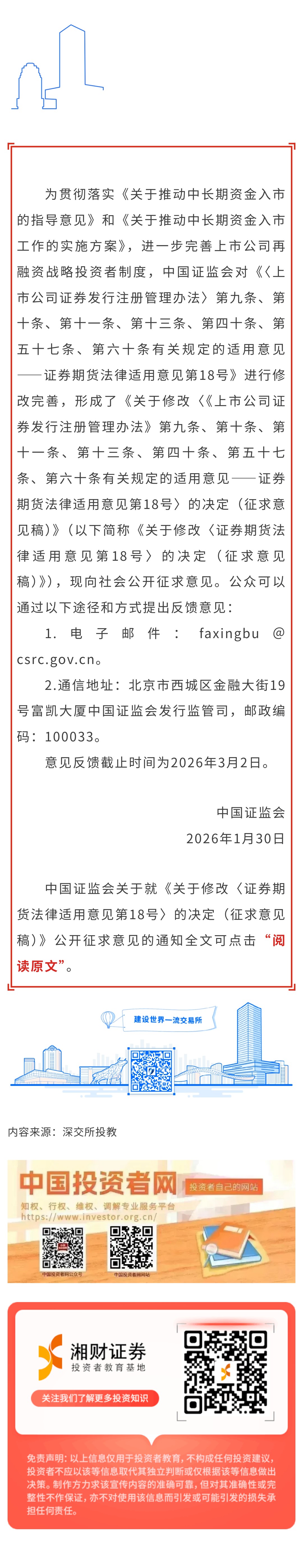 【深交所投教】中国证监会关于就《关于修改〈证券期货法律适用意见第18号〉的决定(征求意见稿)》公开征求意见的通知