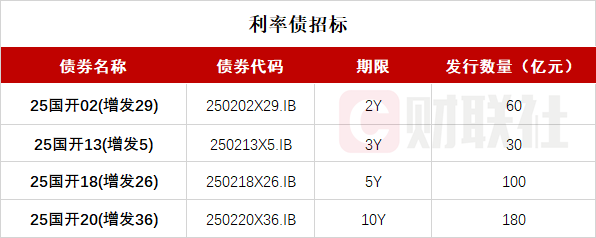 财联社2月10日电,按照此前公布的发行计划,国家开发银行将于09:30-10:30招标发行四期金融债:国家开发银行2025年第二期金融债券(第二十九次增发),期限2年,发行量不超过60亿元,票面利率1.52%;国家开发银行2025年第十三期金融债券(第五次增发),期限3年,发行量不超过30亿元,票面利率1.51%;国家开发银行2025年第十八期金融债券(第二十六次增发),期限5年,发行量不超过100亿元,票面利率1.79%;国家开发银行2025年第二十期金融债券(第三十六次增发),期限10年,发行量不超过180亿元,票面利率1.87%。