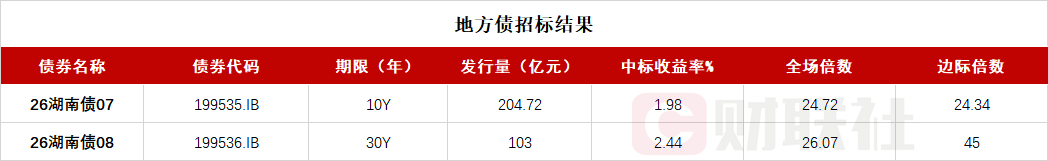 财联社2月10日电,湖南省政府两期地方债已招标结束,投标倍数均在24倍之上,具体中标信息如下: