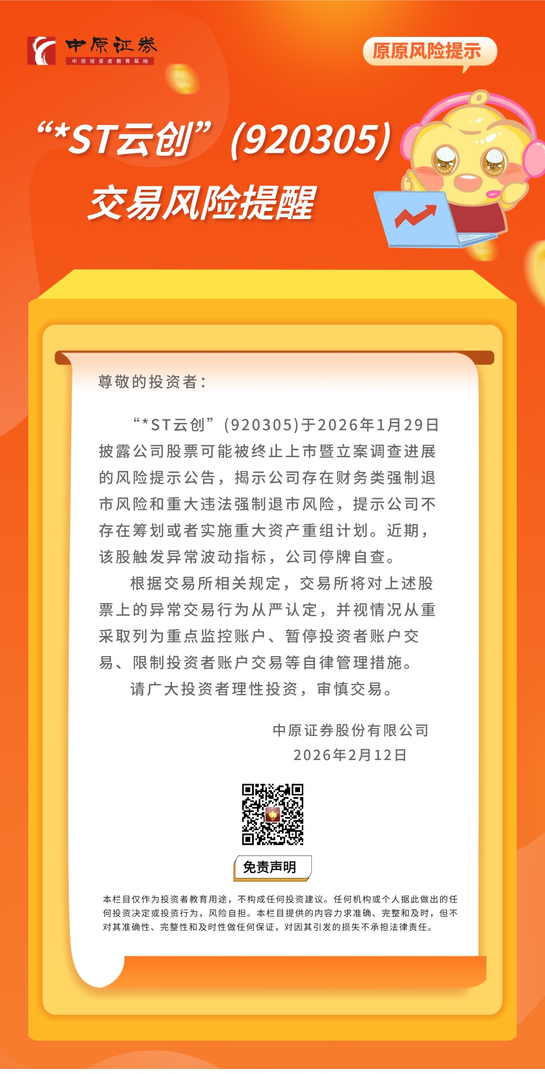 岁末年初防非 | 原原公告:关于“ST云创”(920305)的交易风险提醒
