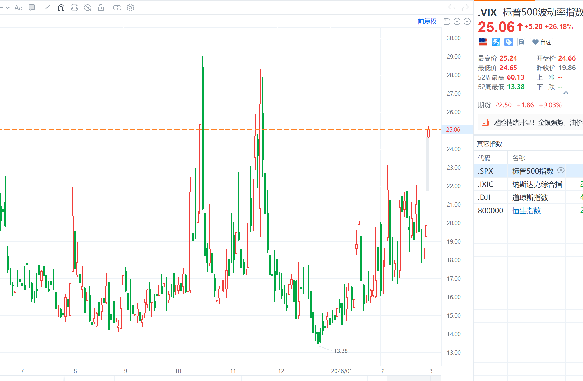 财联社3月2日电,美股恐慌指数VIX跃升至25.24点,创下自11月以来的最高值。