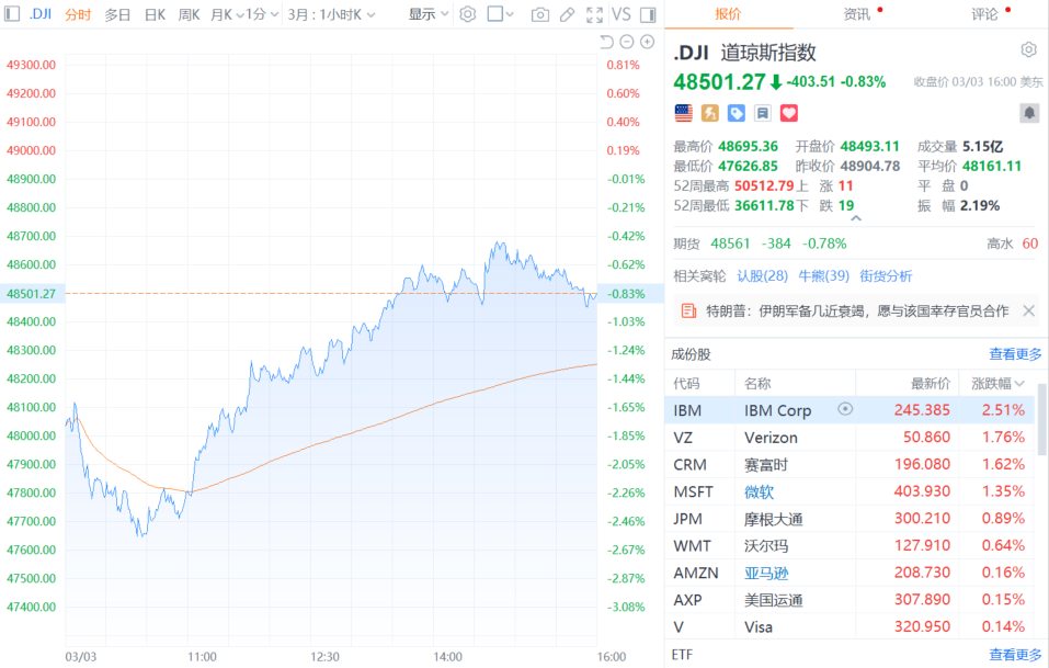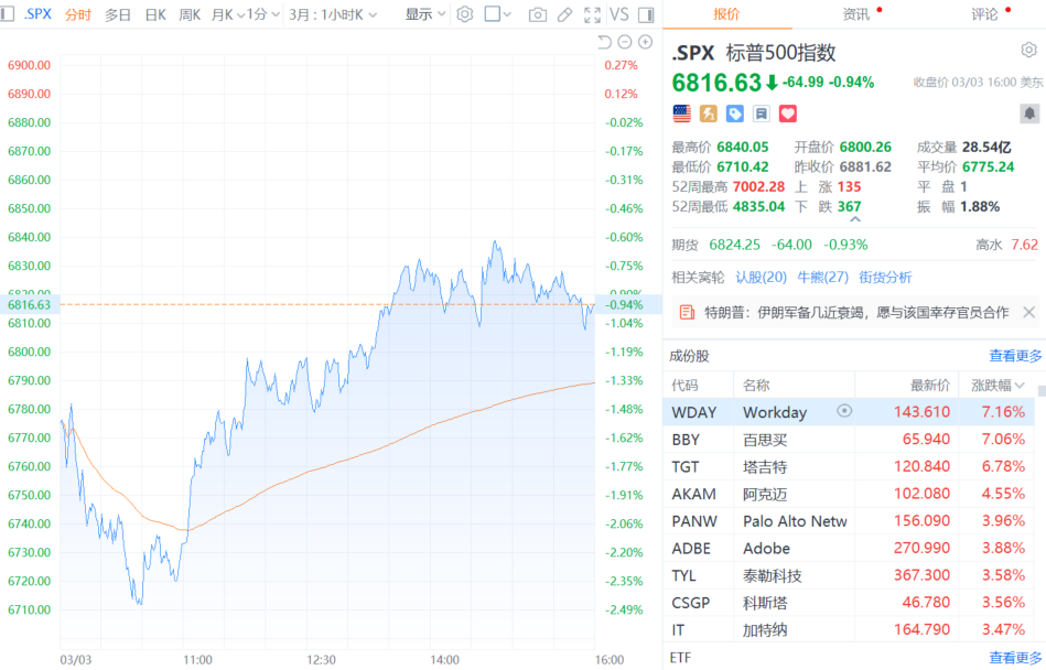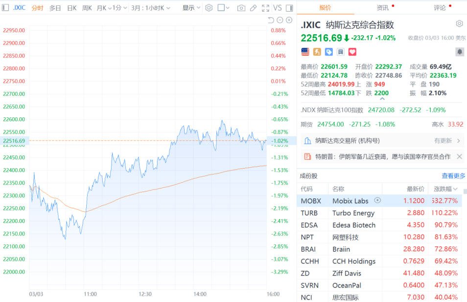 财联社3月4日电,美股三大指数集体收跌,纳指跌1.02%,标普500指数跌0.94%,道指跌0.83%,费城半体指数跌4.58%。大型科技股多数下跌,美光科技跌约8%,英特尔跌超5%,特斯拉跌逾2%,英伟达跌超1%,谷歌、苹果小幅下跌;微软涨超1%,亚马逊、奈飞小幅上涨。塔吉特涨6.7%,创去年4月9日以来最大单日涨幅,该公司在需求改善之际意外地给出向好的业绩指引。