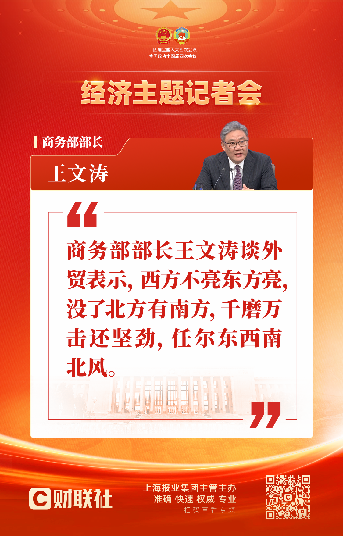 财联社3月6日电,商务部部长谈外贸:西方不亮东方亮,没了北方有南方,千磨万击还坚劲,任尔东西南北风。 (中国新闻网)