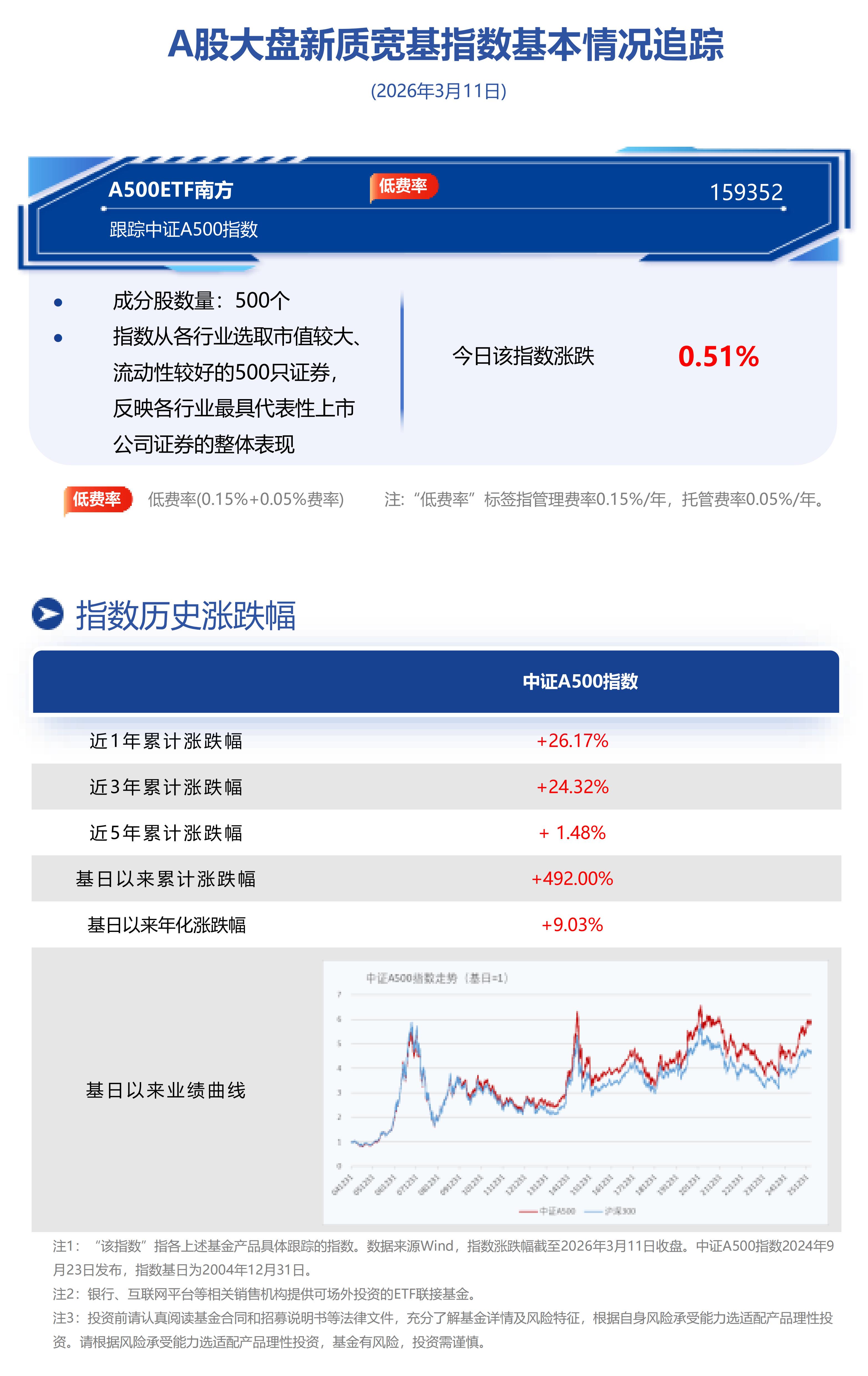 截至2026年3月11日收盘,A500ETF南方(159352)换手17.17%,成交69.28亿元,成交额位列同类深市第1,跟踪标的指数中证A500指数(000510)上涨0.51%。