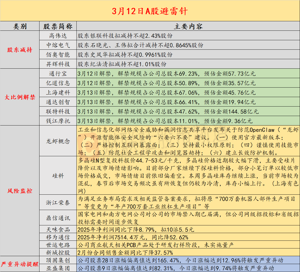 昨日公告的A股拟减持的公司数量较之前有所增多,高伟达股东银联科技拟减持不超2.43%股份;通行宝、亿道信息将迎来超五成以上解禁;工信部NVDB发布关于防范龙虾安全风险的“六要六不要”建议;浙江荣泰为满足业务布局需求及相关监管备案要求,拟将原“700万套机器人部件生产项目”等变更为“年产700万套工业丝杠生产项目”等;部分厂家继续下探硅料价格,市场情绪目前依旧偏看空;2连板鼎信通讯提示风险,国家电网和南方电网公司对公司的市场禁入期已届满,但公司网级招投标和省级招投标需要时间逐步恢复;伊朗称完全有能力封锁霍尔木兹海峡,视美以及其盟友船只可合法打击。