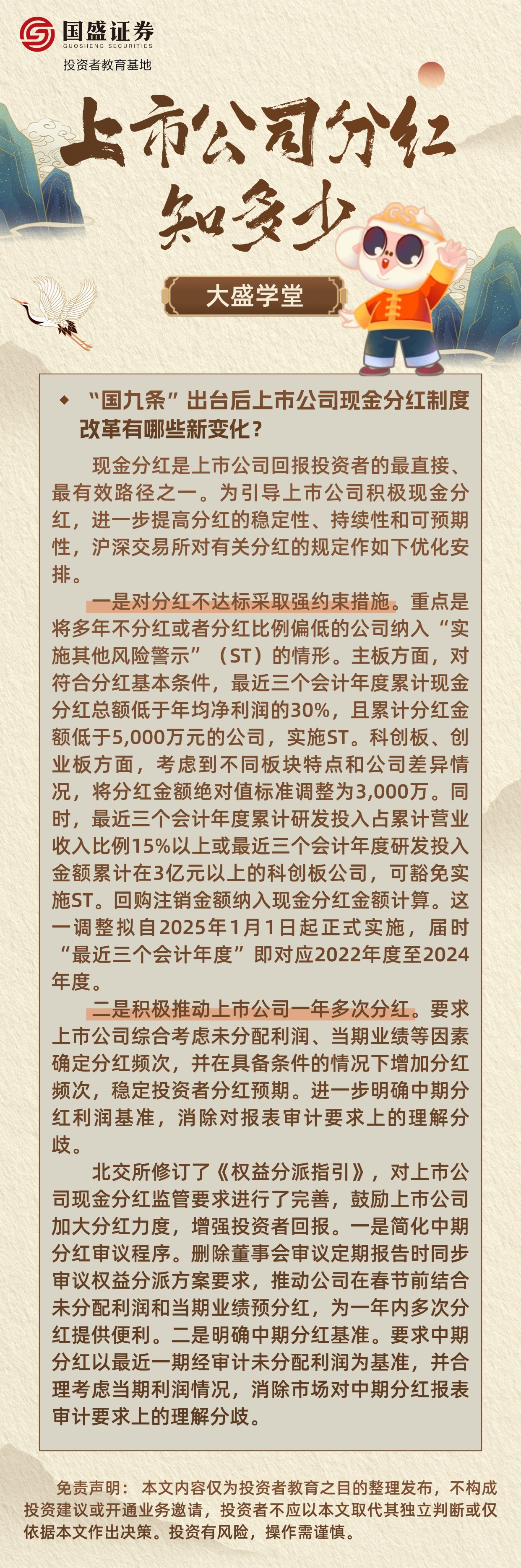 为帮助投资者深入理解分红规则,国盛证券投资者教育基地特制作《上市公司分红知多少》系列图文,内容涵盖分红定义、缴税规定及分红制度改革新变化,助力投资者明晰分红流程,理性分析股价变动,做出更明智的投资决策。下面,一起来学习吧~